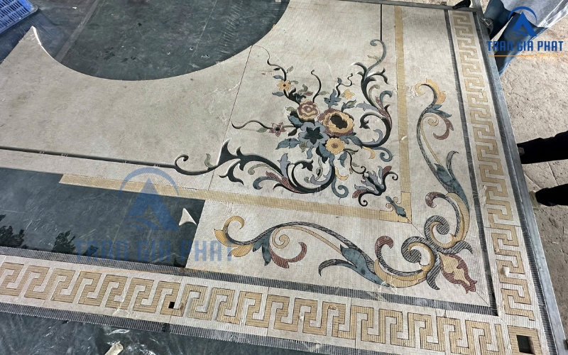 - Gia công CNC & xử lý bề mặt: Khi khách hàng chốt phương án, xưởng sản xuất sẽ nhập liệu bản vẽ vào máy CNC để tiến hành cắt các mảnh đá. Tấm đá lớn thường kích thước 60×60 cm hoặc lớn hơn sẽ được cắt thành từng phần của hoa văn với độ chính xác cao. Các mảnh sau khi cắt được đánh số và ráp thử để kiểm tra độ khớp. Bề mặt các mảnh đá cũng được xử lý hoàn thiện: mài nhẵn cạnh, đánh bóng bề mặt hoặc tạo nhám chống trơn nếu đặt ở ngoại thất. Mọi thứ được kiểm tra kỹ lưỡng trước khi xuất xưởng.
