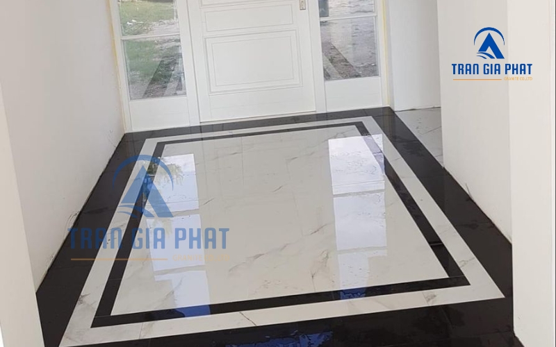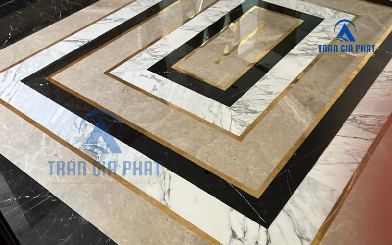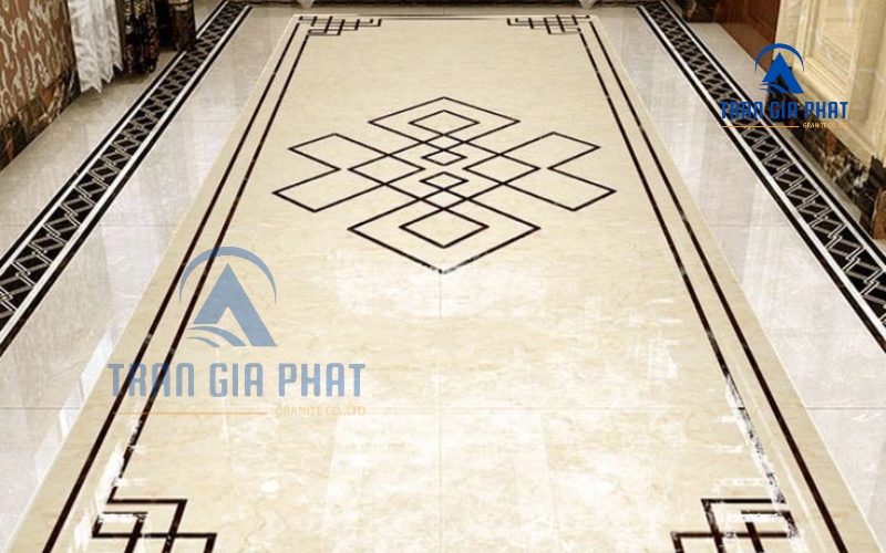 - Thảm đá viền khung tối giản: Đây là kiểu hoa văn mô phỏng tấm thảm trải sàn bằng đá, với phần viền khung bao quanh và trung tâm trơn hoặc ít họa tiết. Khung viền có thể là hình chữ nhật hoặc hình vuông đơn giản, đôi khi thêm một đường chỉ mảnh bên trong. Mẫu thảm đá viền tối giản thường dùng để nhấn mạnh khu vực sảnh biệt thự hoặc sảnh chờ khách sạn nơi muốn tạo ấn tượng sang trọng ngay khi bước vào nhưng không quá phô diễn. Viền khung đá màu đậm trên nền đá màu sáng tạo cảm giác khung tranh trang trí dưới sàn, rất độc đáo mà vẫn nhã nhặn