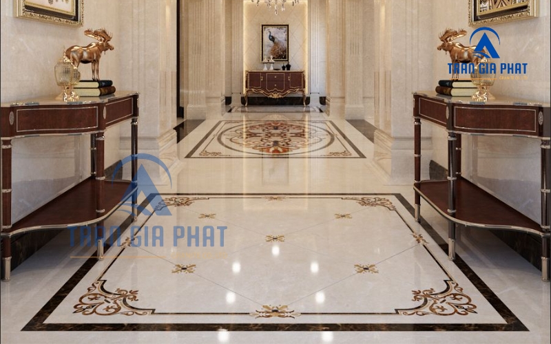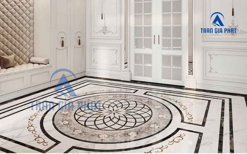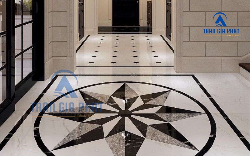 - Marble (đá cẩm thạch): Marble nổi tiếng với vẻ đẹp sang trọng, tinh tế nhờ những đường vân đá tự nhiên độc đáo. So với granite, đá marble mềm hơn một chút, chịu lực kém hơn nên thường dùng ở những chỗ ít va chạm mạnh. Tuy nhiên, chính vân đá sống động của marble lại rất được ưa chuộng trong hoa văn lát sàn phong cách tối giản kiểu luxury.