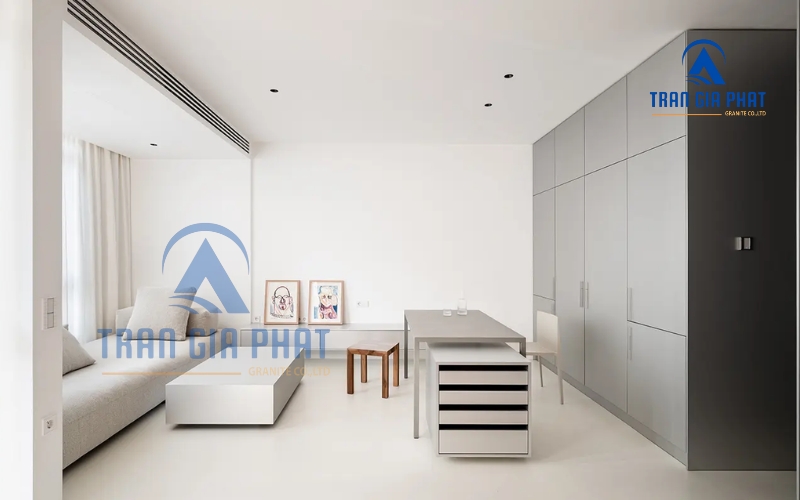 - Linh hoạt phối màu: Hoa văn đá CNC phong cách tối giản thường ưu tiên các tông màu trung tính như trắng, đen, xám, be… Đây là những màu dễ phối cùng các màu nội thất khác. Sự tương phản nhẹ giữa các gam màu trung tính trong hoa văn đá (như trắng – xám, đen – trắng) cũng đủ tạo nét mà vẫn hài hòa. Nhờ linh hoạt về màu sắc, hoa văn đá CNC tối giản có thể ứng dụng trong nhiều phong cách nội thất hiện đại, từ Scandinavian đến Modern Luxury, mà không sợ lệch tông.