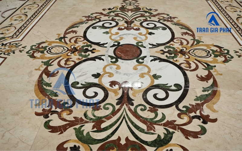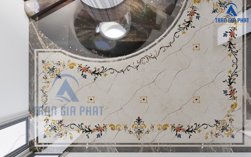 • Sàn sảnh và sàn nhà: Những tấm đá hoa văn được sử dụng lát ở trung tâm sảnh khách sạn, biệt thự, tòa nhà thương mại… tạo điểm nhấn thu hút và thể hiện sự đẳng cấp của không gian ngay từ cái nhìn đầu tiên. Tại tiền sảnh lớn hoặc phòng khách rộng, một bộ hoa văn đá tròn hoặc vuông ở giữa sàn nhà giống như tấm thảm đá độc đáo, dẫn dắt ánh nhìn và tạo ấn tượng khó quên cho khách ghé thăm.