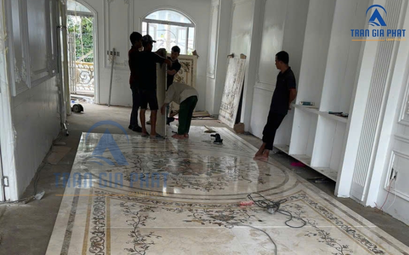 8. Lắp đặt tại công trình: Khi hoa văn đá được chuyển đến, đội ngũ thi công của xưởng sẽ tiến hành lắp đặt theo đúng bản vẽ và vị trí đã định. Nhờ toàn bộ hoa văn đã được gia công chính xác sẵn tại xưởng, việc lắp ghép tại công trình diễn ra khá nhanh chóng, chỉ cần đặt các mảnh đá theo đúng thứ tự và dán cố định xuống nền bằng keo chuyên dụng. Cuối cùng, khách hàng sẽ nghiệm thu tổng thể xem hoa văn đá đã đúng thiết kế, nổi bật như mong muốn chưa. Công đoạn lắp đặt do đội ngũ chuyên nghiệp thực hiện giúp đảm bảo tiến độ và chất lượng, thường chỉ trong 1-2 ngày là hoàn thiện một bộ hoa văn đá cỡ lớn.