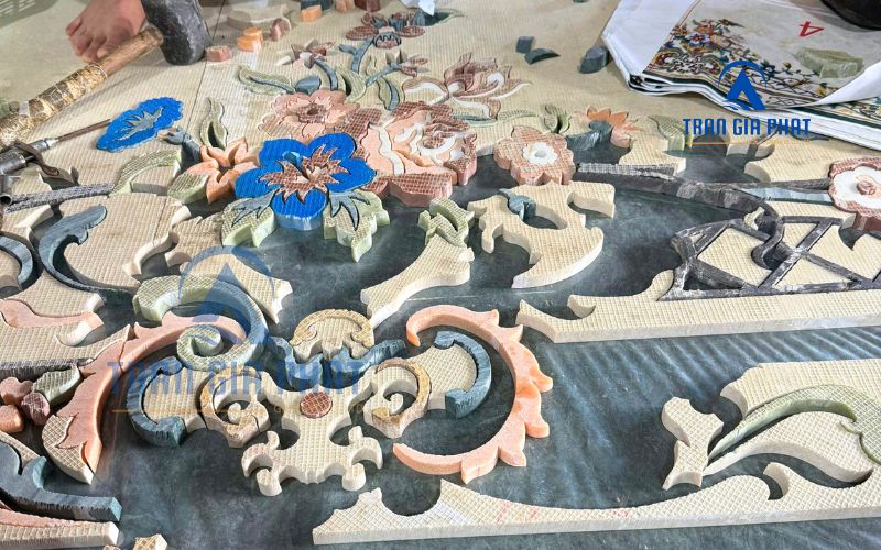 5. Xử lý bề mặt & hoàn thiện: Sau khi gia công cắt tạo hình, các mảnh đá sẽ trải qua công đoạn xử lý bề mặt để đạt độ thẩm mỹ cao nhất. Tùy yêu cầu thiết kế, xưởng có thể tiến hành mài bóng bề mặt đá để tạo độ sáng, Những vị trí góc cạnh được mài nhẵn để an toàn khi sử dụng. Nếu hoa văn gồm nhiều mảnh ghép, thợ sẽ ghép thử các mảnh trên nền phẳng tại xưởng để căn chỉnh độ khít, sau đó mới chuyển sang bước kiểm tra cuối cùng.