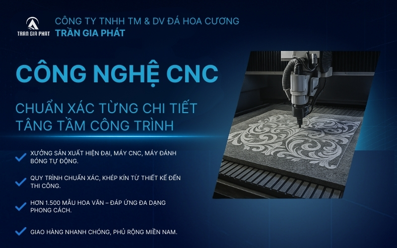 - Gia công tại xưởng (CNC hiện đại): Đá tự nhiên (granite, marble) được vận chuyển tới xưởng sản xuất. Sử dụng công nghệ cắt CNC năm trục cao cấp, các phiến đá được gia công chính xác từng hoa văn. Xưởng Trần Gia Phát đầu tư máy móc hiện đại như máy CNC tia nước 5 trục, máy đánh bóng tự động… đảm bảo độ hoàn thiện bề mặt đạt chuẩn cao nhất. Sau khi cắt, các mảnh hoa văn được mài, đánh bóng tỉ mỉ để bảo đảm độ mịn và sắc nét của chi tiết.