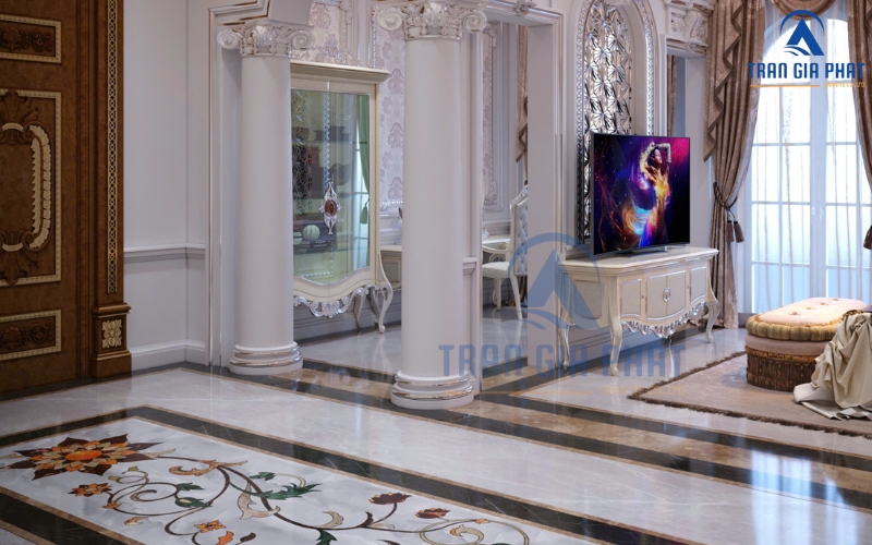 - Sàn phòng khách, đại sảnh: Ở các biệt thự, khách sạn, tòa nhà cao cấp, hoa văn đá thường được lát ở trung tâm phòng khách hoặc sảnh lớn. Mẫu hoa văn hình tròn thường đặt ở trung tâm sàn nhà tạo điểm nhấn nghệ thuật. Những mẫu trống đồng hoặc hoa văn cổ điển cũng được ưu tiên cho đại sảnh để toát lên vẻ sang trọng đẳng cấp.