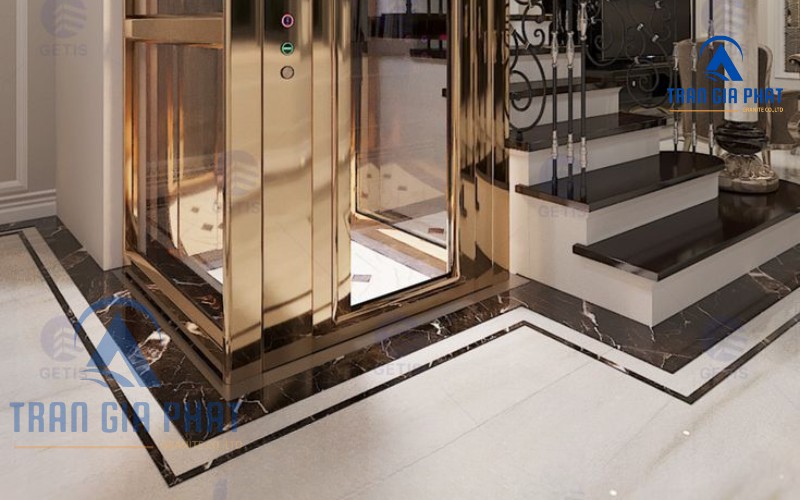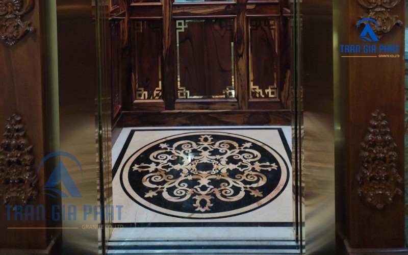 - Ốp mặt tiền cửa thang máy và bên trong cabin: Cửa thang máy các tòa nhà cao cấp thường được ốp bằng đá granite hoặc marble hoa văn, vừa tạo cảm giác sang trọng ngay sảnh chờ thang máy, vừa chống trầy xước hiệu quả cho khung cửa. Bên trong cabin, sàn thang máy lát một tấm đá hoa văn nhỏ tạo điểm nhấn thay cho sàn kim loại đơn điệu. Hoa văn đá dưới sàn cabin giúp không gian thang máy bớt nhàm chán và còn tạo cảm giác rộng hơn thực tế nhờ bề mặt bóng và họa tiết thu hút.