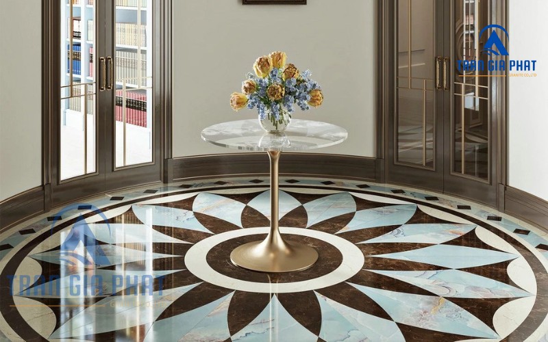- Thảm đá hoa văn CNC tại sảnh lớn: Tại các sảnh biệt thự, khách sạn, trung tâm thương mại, thường đặt một tấm đá hoa văn cỡ lớn chính giữa sàn như một chiếc thảm trang trí cao cấp. Hoa văn có thể là dạng tròn cổ điển với họa tiết đối xứng, hay hình vuông hiện đại với đường nét hình học. Thảm đá hoa văn ở vị trí trung tâm sảnh lớn ngay lập tức tạo ấn tượng sang trọng khi bước vào. Nhìn từ trên cao, hoa văn tròn ở sảnh kết hợp với đèn chùm tròn phía trần còn tạo hiệu ứng không gian cân xứng hài hòa. Đây là điểm nhấn kiến trúc thường thấy tại sảnh khách sạn 5 sao hoặc biệt thự cao cấp.