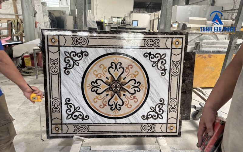 - Phối màu đá granite, marble tăng chiều sâu: Sự kết hợp các loại đá với màu sắc khác nhau trong một mẫu hoa văn giúp sàn nhà thêm phần sống động. Chẳng hạn, đá granite đen có thể viền khung cho phần trung tâm bằng đá marble trắng vân mây, tạo nên tương phản nổi bật và chiều sâu cho hoa văn. Nhiều mẫu thảm đá CNC cổ điển phối 3-5 tông màu đá tự nhiên một cách hài hòa, giúp sàn nhà trông như một bức tranh đa sắc tuyệt đẹp. Màu sắc của đá là màu tự nhiên, không phai nên hoa văn sàn nhà sẽ giữ được độ tươi mới và sắc nét qua thời gian.